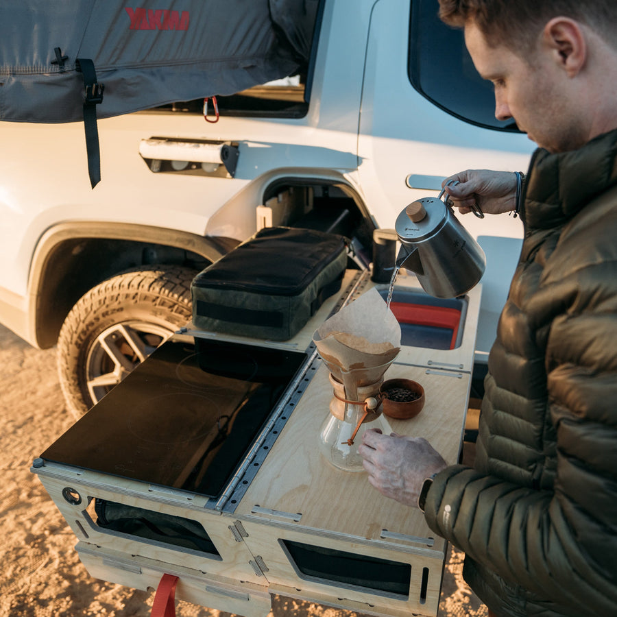 That’s where our gear comes in. Our Overland Kitchen was designed for campsite cooking, but it shines at tailgates, too. Sliding neatly out of the Rivian R1T’s gear tunnel, it keeps everything organized and ready for action—whether you’re flipping pancakes at dawn patrol or stirring up chile con queso before kickoff.