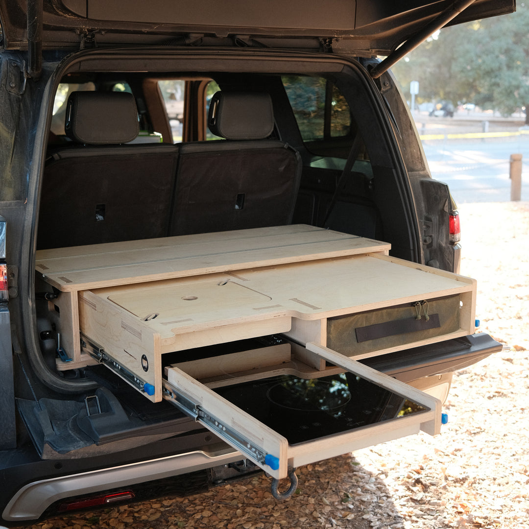 The Thunderbolt Adventure Supply Camp Kitchen comes with an integrated two-burner induction cooktop. It is matched to the outlet in the Rivian and is equipped with load balancing so that it does not trip the outlet’s breaker.