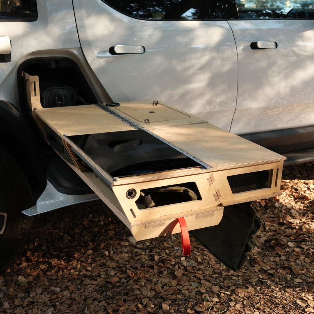 We recommend you utilize the leveling function in your Rivian (found under Camp Mode). We tend to set our truck in Standard or High depending on the terrain of our campsite, and then initiate the leveling function. Once that is complete, the Camp Kitchen will be as level as your vehicle.