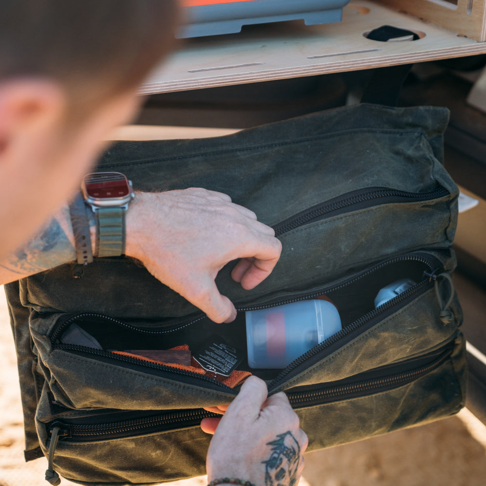 Constructed with powder coated aluminum and powered by your Rivian R1T, it features a dual burner induction cooktop, 4 rugged waxed canvas storage bags, and a collapsable sink basin. Most notably the kitchen folds open to unveil over 9 square feet of countertop space for prep! Heck, we even included a bottle opener for the chef! The kitchen is an amazing accessory not only for camping but also for tailgating!
