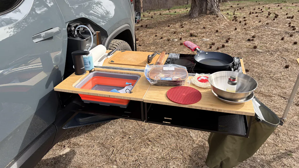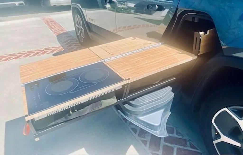 The Thunderbolt Adventure Supply Camp Kitchen comes with an integrated two-burner induction cooktop. It is matched to the outlet in the Rivian and is equipped with load balancing so that it does not trip the outlet’s breaker.